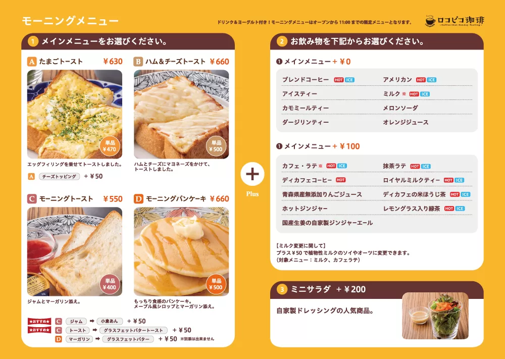モーニングのセットはドリンク・ヨーグルト付きです。お飲み物はセットドリンクメニューからお選びください。オープンから11:00までのメニューとなります。