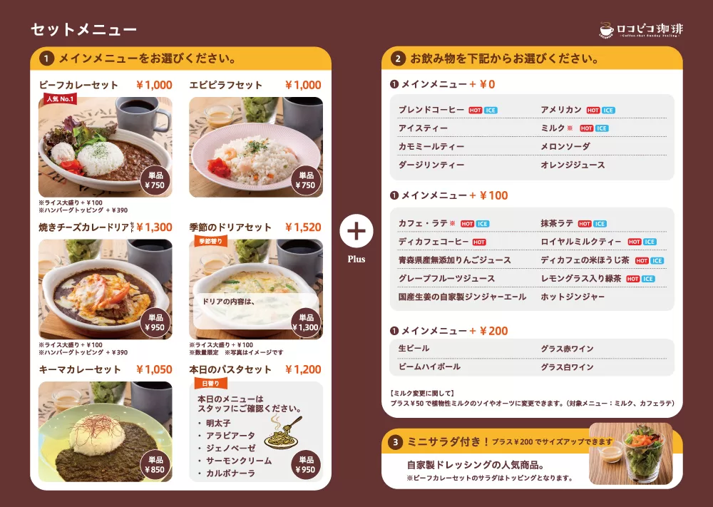 - 本日のパスタセット:パスタメニュー(明太子/アラビアータ/サーモンクリーム/ジェノベーゼ/カルボナーラ)はスタッフまでご確認ください。